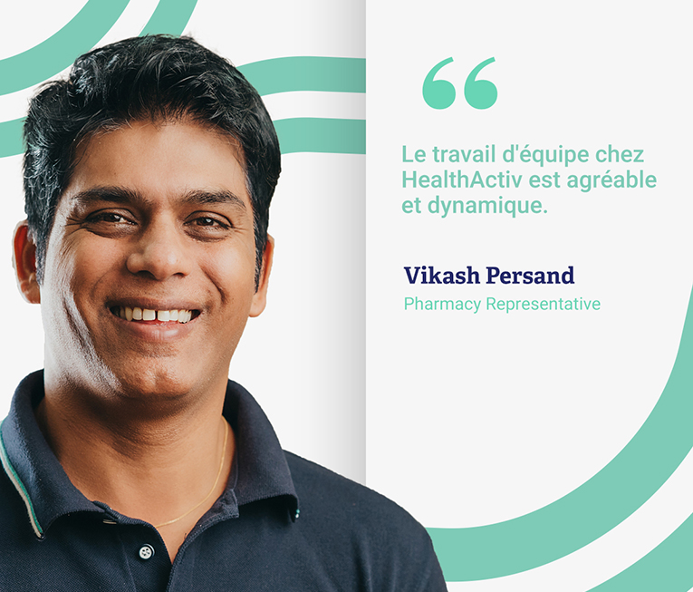 J'ai commencé chez HealthActiv en tant que Telesales il y a plus de 10 ans et j'interagissais avec les clients principalement par téléphone. Aujourd'hui, je suis Pharmacy Representative et je suis sur le terrain. Je rends régulièrement visites aux Pharmaciens pour comprendre leurs besoins et les aider à mieux servir leurs clients. C'est plus challenging, mais cela me passionne ! »